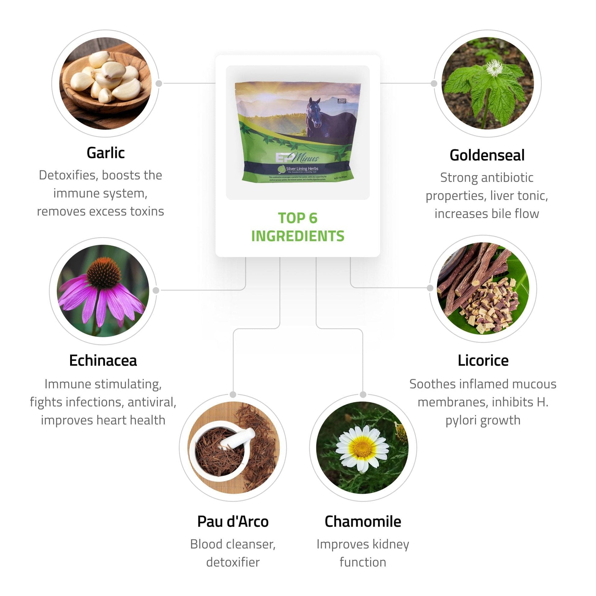 EP Minus is an essential combination of herbs that effectively supports a parasite-free system, supports normal travel patterns and gait, and provides unparalleled support to the central nervous, digestive, and immune systems of horses. It is highly recommended as a must-have for maintaining a healthy and parasite-free system. Moreover, it offers unparalleled support to the immune and digestive systems while ensuring the proper functioning of the central nervous system. Don't wait any longer to give your horse the best possible care - add EP Minus to their regimen today!